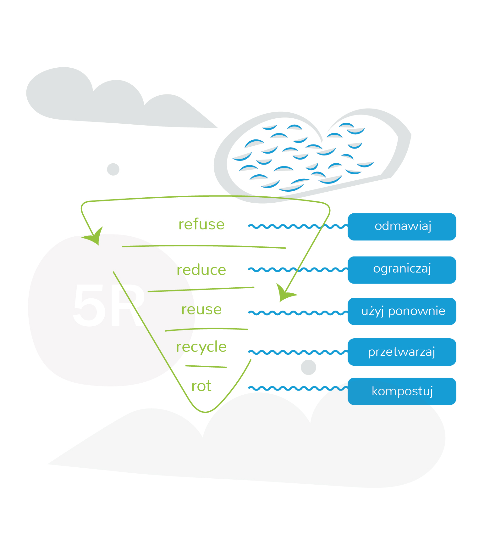 Na początek proponujemy trzy zestawy zadań w ramach wyzwania #BiuroZeroWaste. Skupiliśmy się na pięciu obszarach: kuchnia, łazienka, stanowisko pracy, konferencje / spotkania oraz segregowanie odpadów.